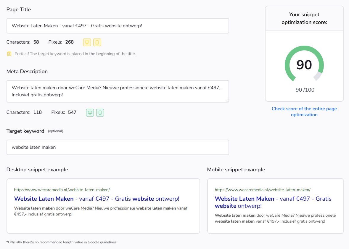 Er zijn gratis tools waarmee je kunt testen hoe je titel en beschrijving eruitzien in de zoekresultaten. Een handig voorbeeld is de SE Ranking. Daarmee zie je hoe je SERP-resultaat wordt getoond en of je tekst niet te lang is. Voor grotere websites zijn er ook betaalde tools die helpen om titels en beschrijvingen op schaal te beheren en te verbeteren.