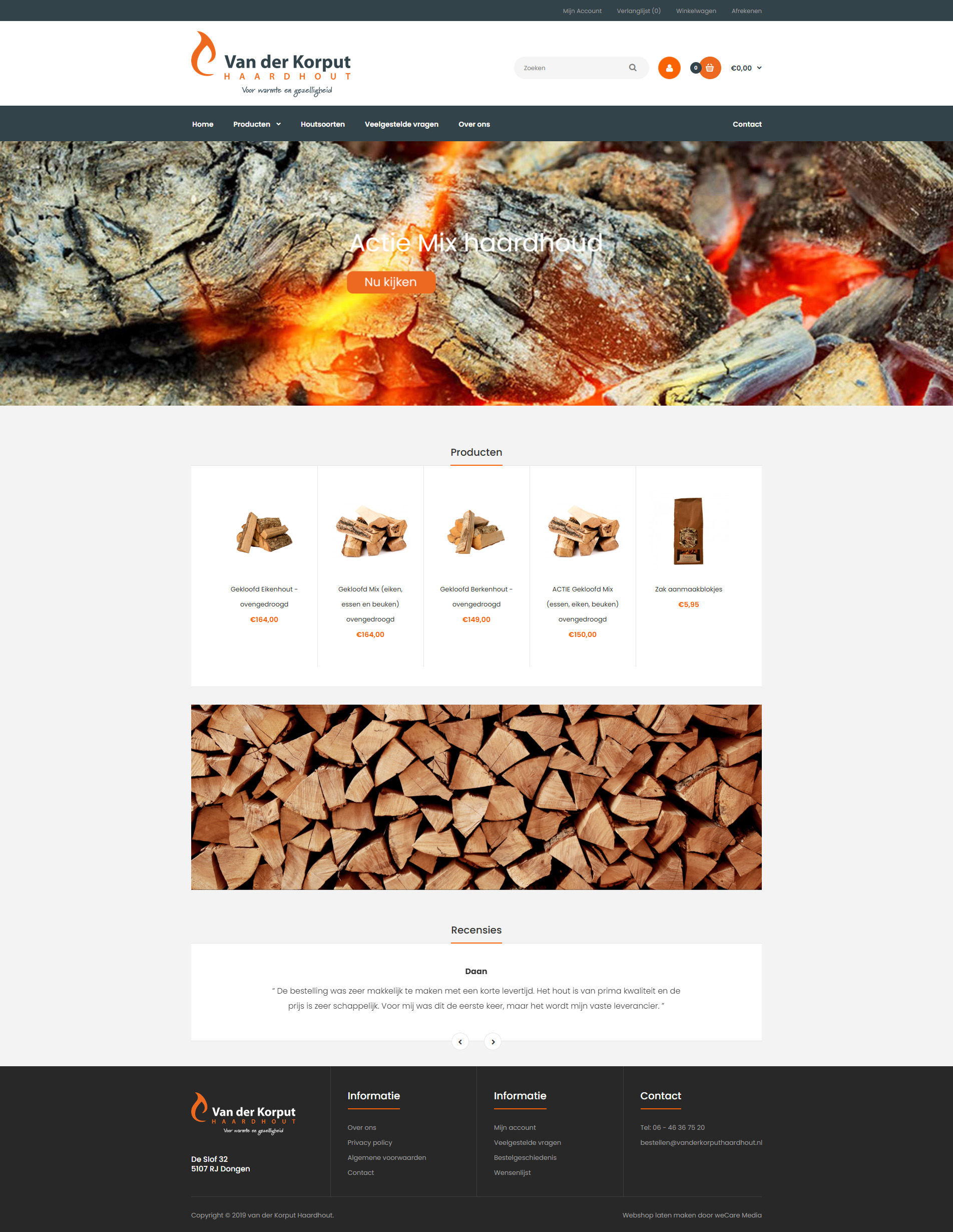 Voor Van der Korput Haardhout hebben wij bij weCare Media een nieuwe webshop ontwikkeld voor het eenvoudig bestellen van haardhout. De webshop is opgezet met een rustig en overzichtelijk ontwerp, zodat klanten snel producten kunnen vinden en hun bestelling eenvoudig kunnen afronden.